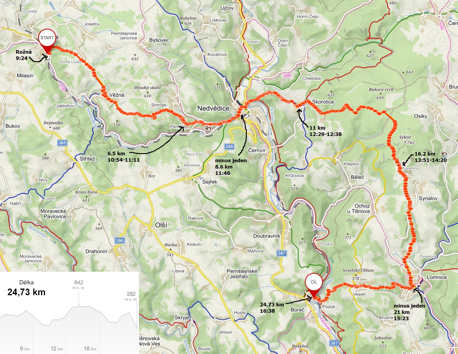 Plánovaná trasa (25 km) vede přes hrad Pernštejn, po kopcích a přes několik malých vesniček. Možnost odpojit se za hradem Pernštejn na vlakové zastávce v Nedvědicích (8.5 km). Ukončení na vlakové zastávce v Borači, návrat do Brna opět vlakem (zóny 100+101+ 4 další).