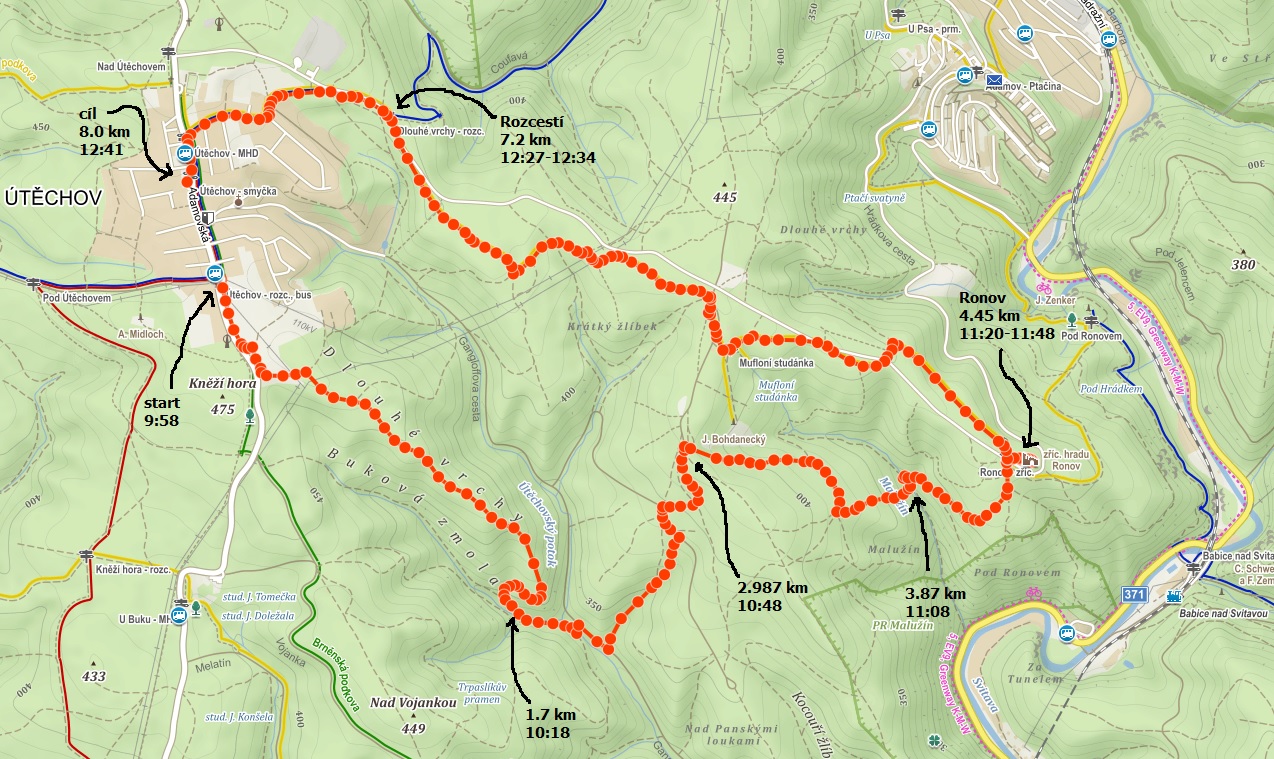 Sraz v 9:36 na zastávce autobusu 57, "Rozcestí" v Útěchově.