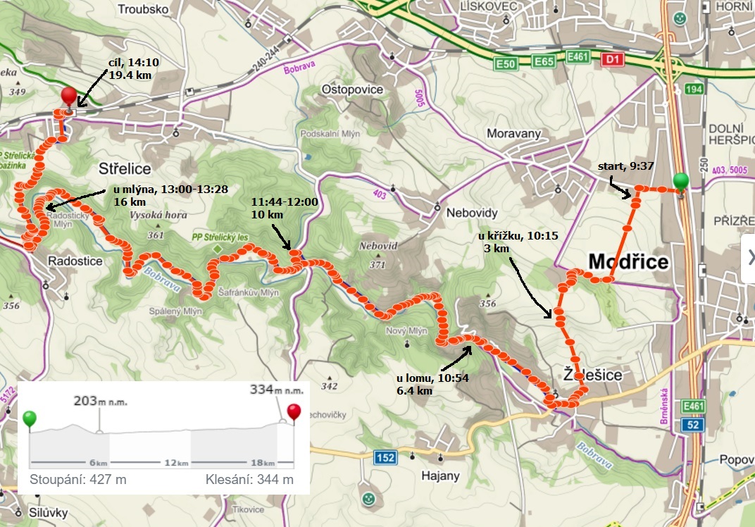 Trasa 19 km - přes kopec do Želešic, pak údolím řeky Bobravy do Radostic,
