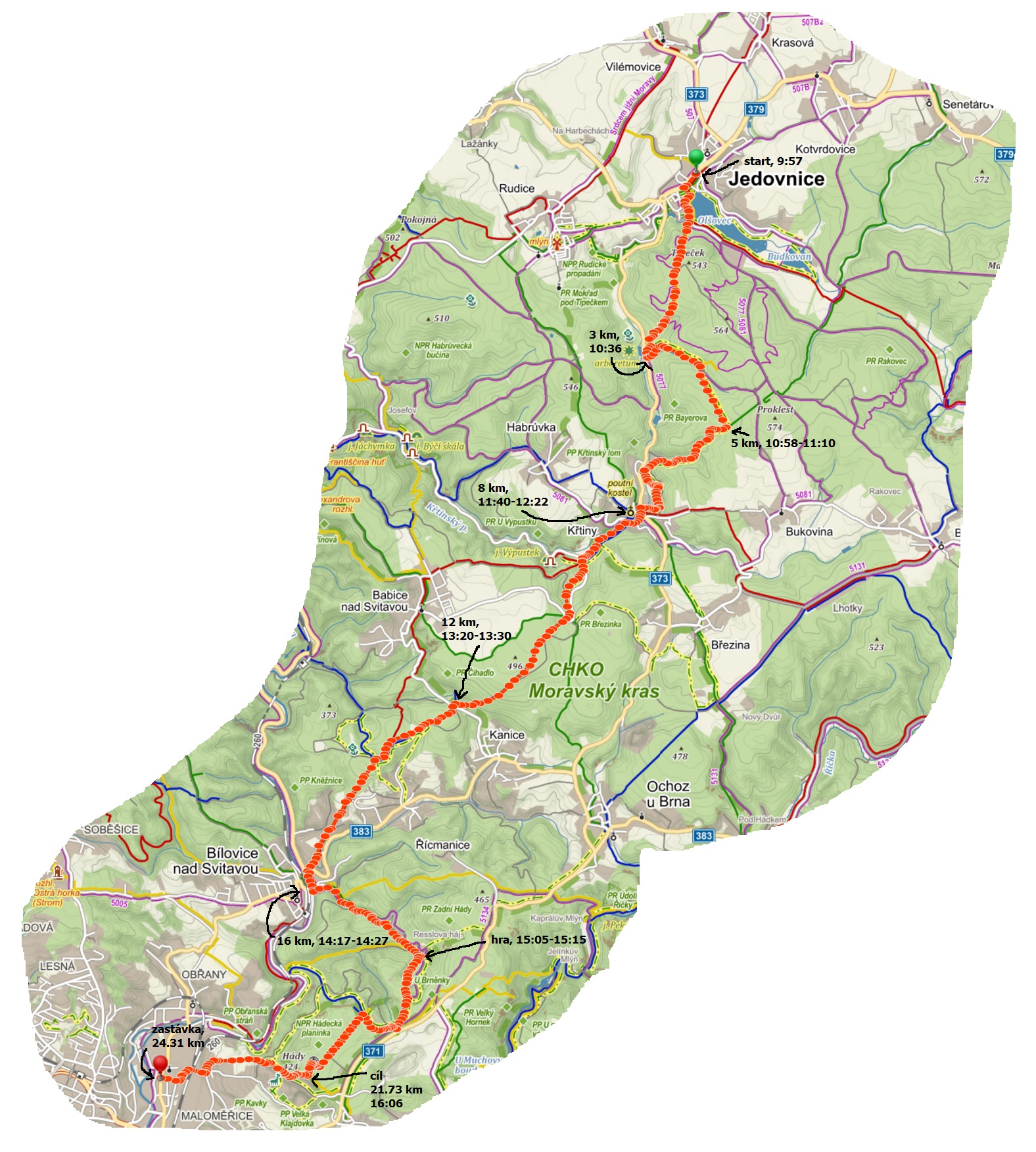 Plánovaná trasa vede po žluté turistické značce do Křtin (8 km, možný návrat autobusem), dále po modré a červené do Bílovic nad Svitavou (17 km, možný návrat vlakem nebo autobusem). Na závěr výstup po zelené a po žluté na Hády, (23 km), kde s výhledem na Brno provedeme oficiální zakončení výletu. Návrat MHD.